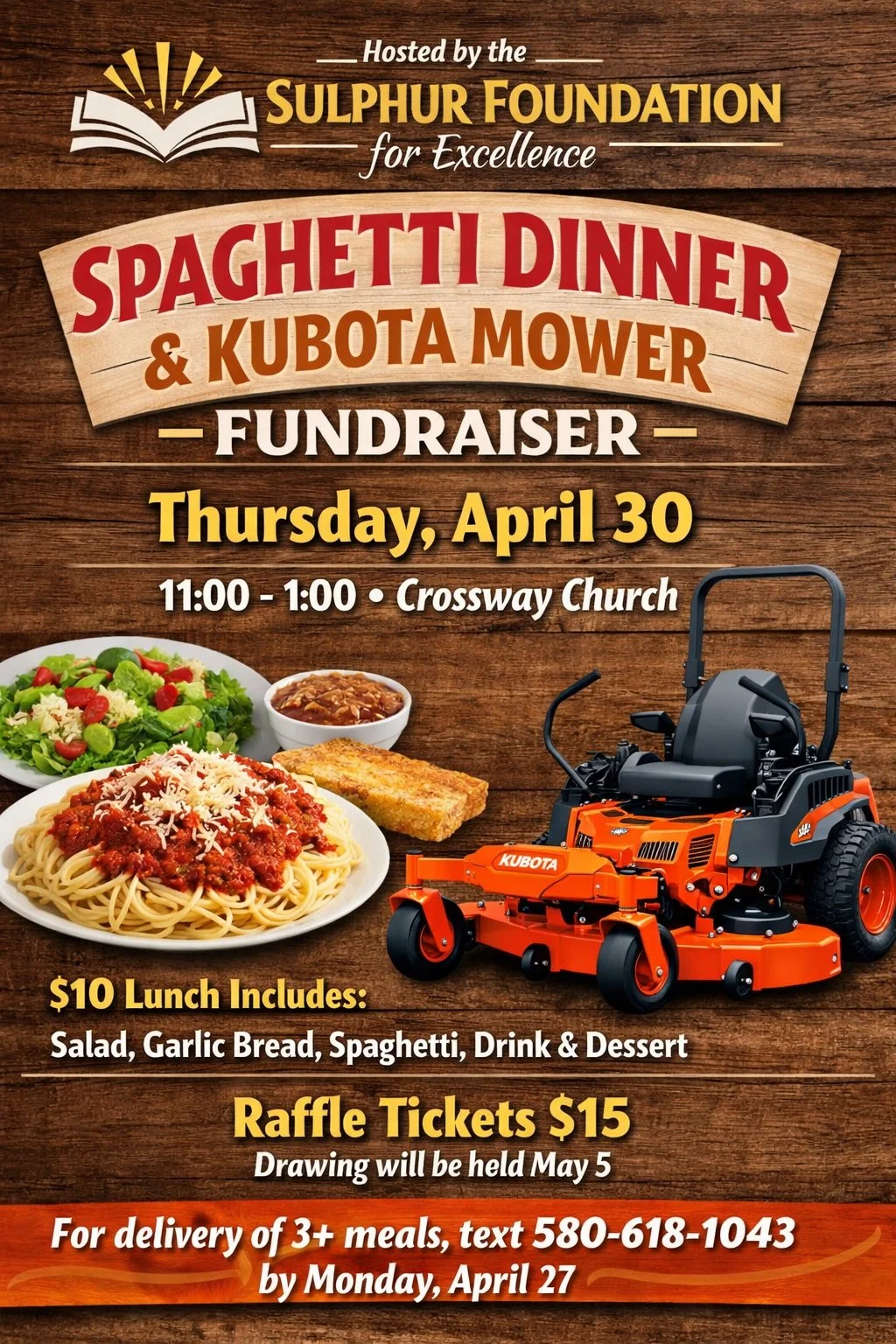 Join us for a great meal and a great cause on Thursday, April 30 from 11:00 AM–1:00 PM at Crossway Church. The Sulphur Foundation for Excellence in Education is hosting a community spaghetti dinner to support local students and classrooms across Sulphur Public Schools.